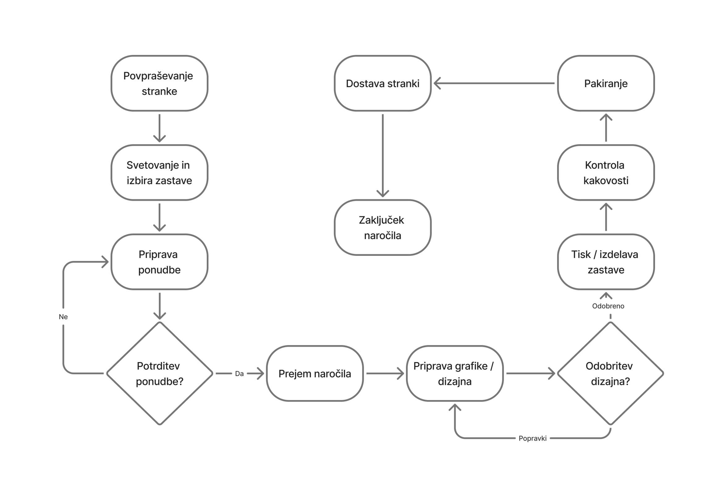 Po prejemu grafike vam bo naš grafični oddelek v predogled poslal skico s postavitvijo zastav in načinom šivanja. Po vaših morebitnih dopolnitvah oziroma potrditvi ustreznosti postavitve bomo začeli z izdelavo zastav.
